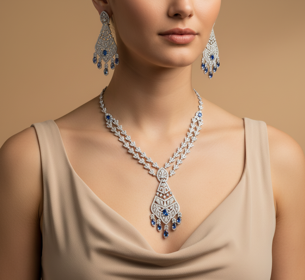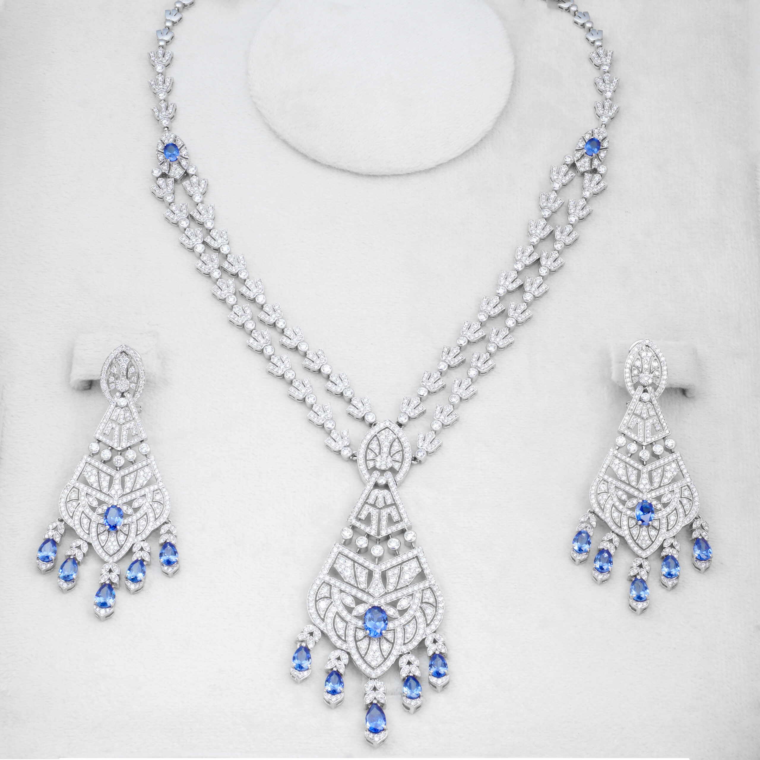 A breathtaking blue sapphire and diamond necklace set, featuring an elaborate statement necklace and matching chandelier earrings. The necklace presents a dual-strand design composed of intricate, diamond-studded leaf or feather-like motifs. These strands converge into a magnificent, multi-tiered pendant that boasts intricate diamond scrollwork, centered by a round blue sapphire, and adorned with dangling pear-shaped blue sapphires.