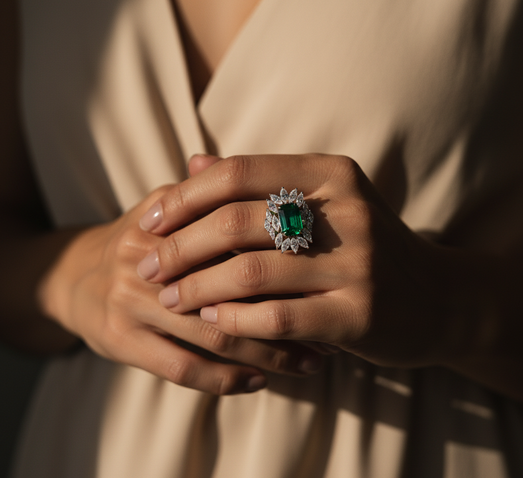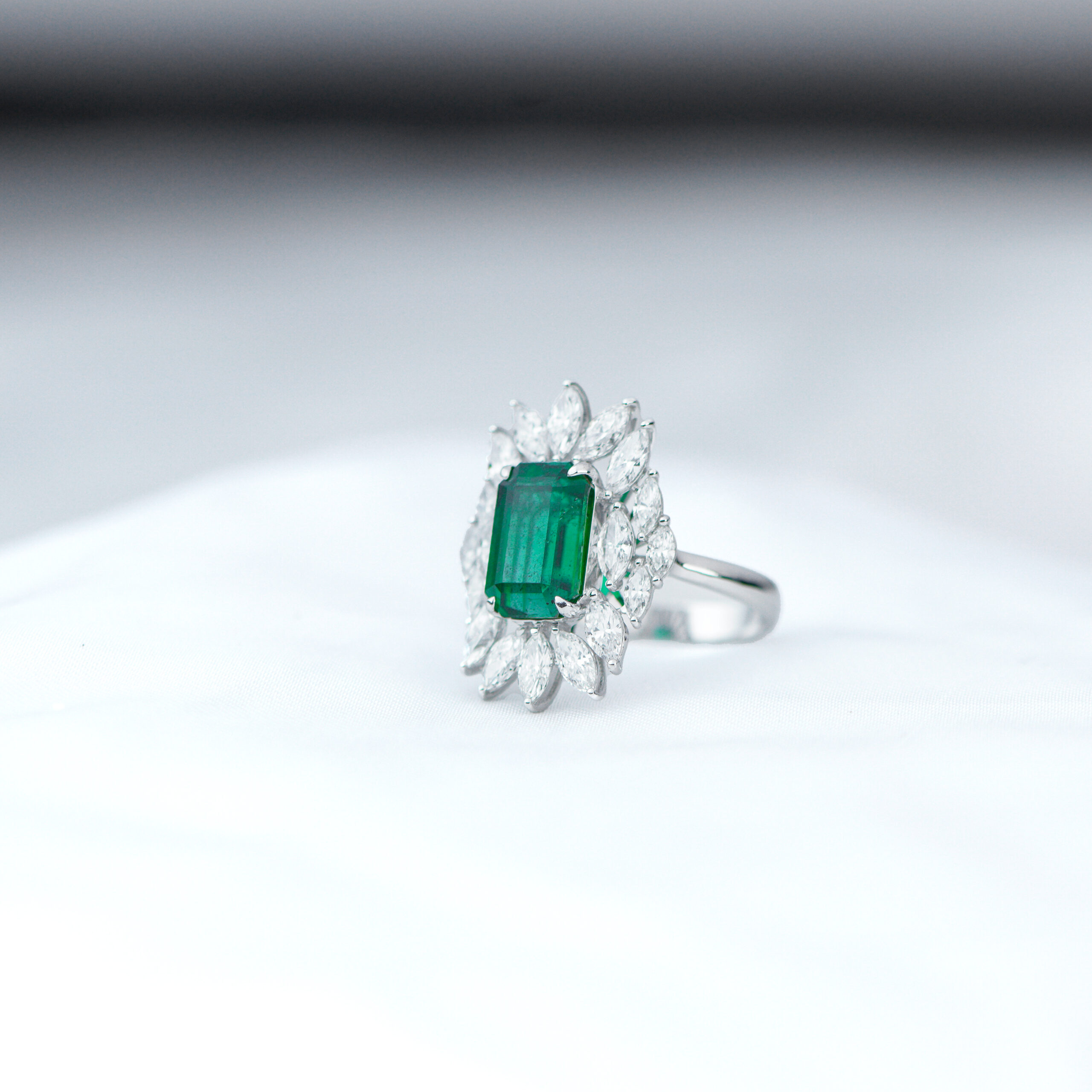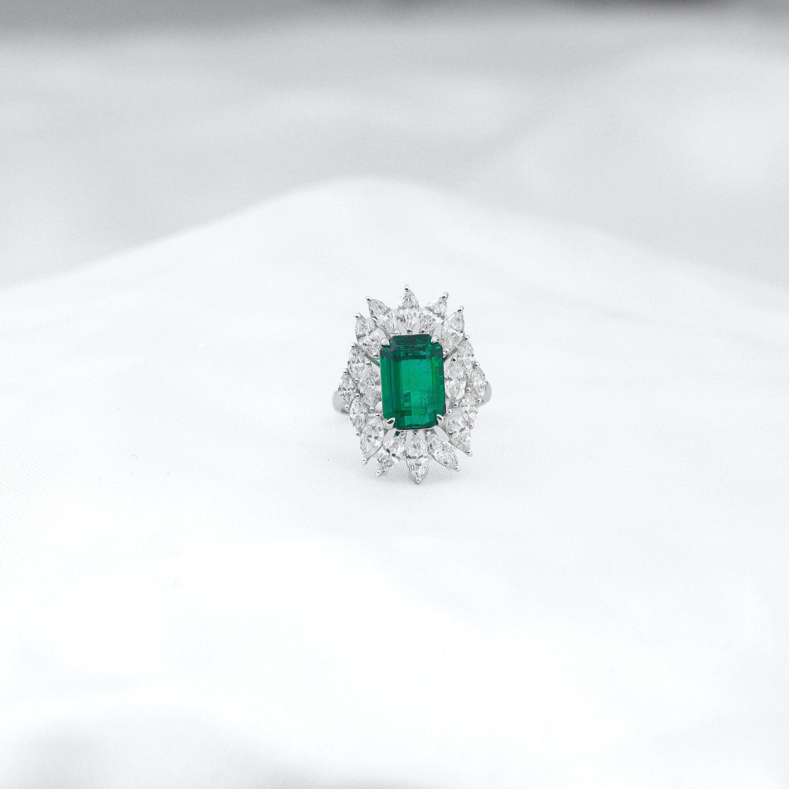 A stunning emerald ring featuring a vivid green, rectangular-cut center stone surrounded by a halo of sparkling marquise-cut diamonds. Set in a sleek silver band, the ring exudes elegance and timeless luxury.